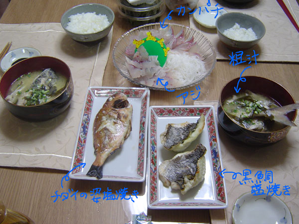 クロダイの塩焼き(身のみ)、チダイの姿塩焼き、釣った魚勢ぞろいの粗汁、カンパチとアジのお刺し身