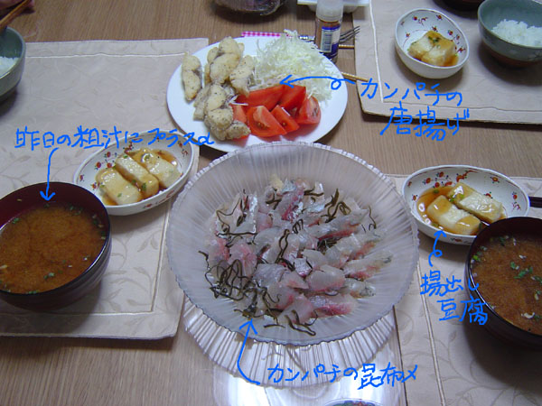 根菜入り粗汁(昨日の残りの粗汁に根菜を入れて)、カンパチの昆布〆、カンパチの唐揚げ(塩胡椒)&揚げ出し豆腐